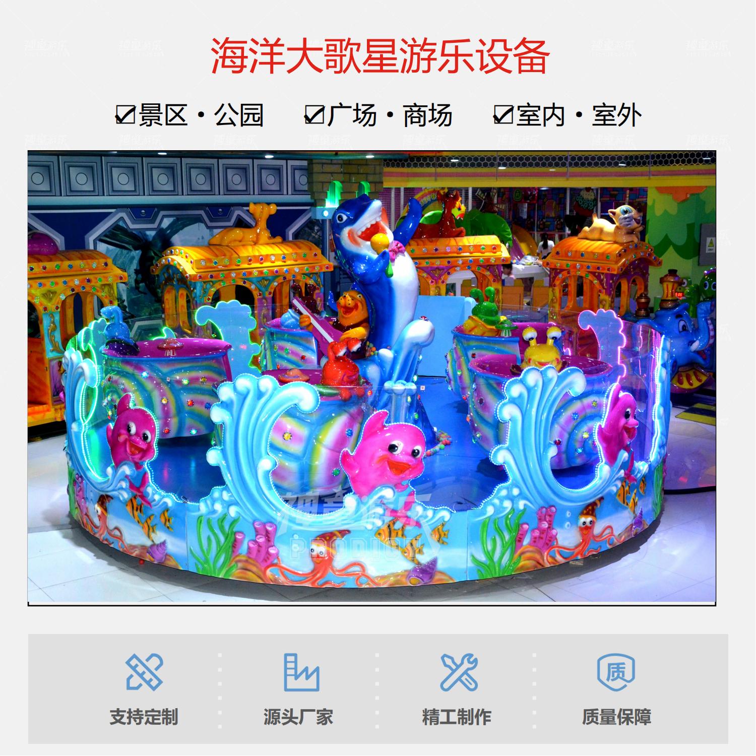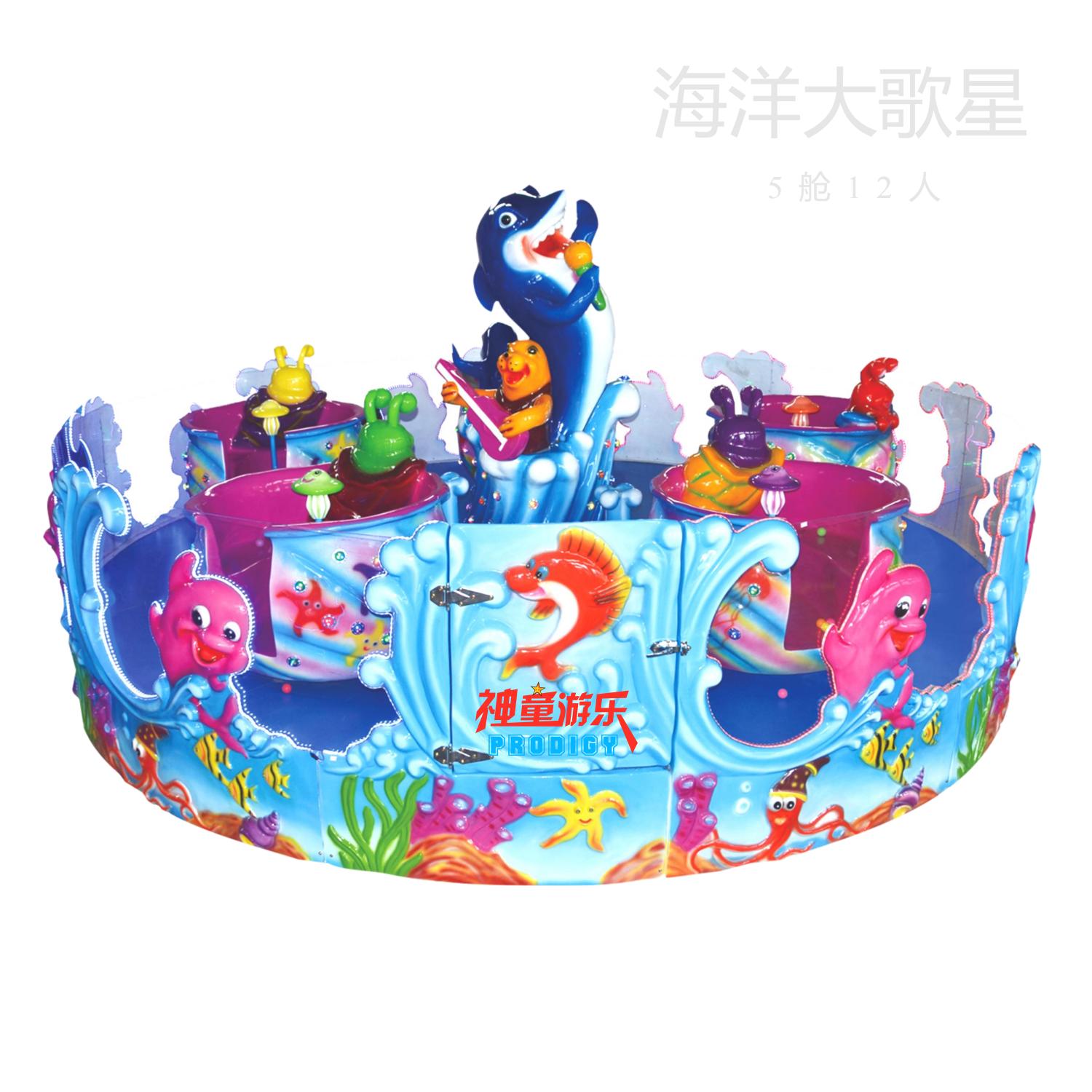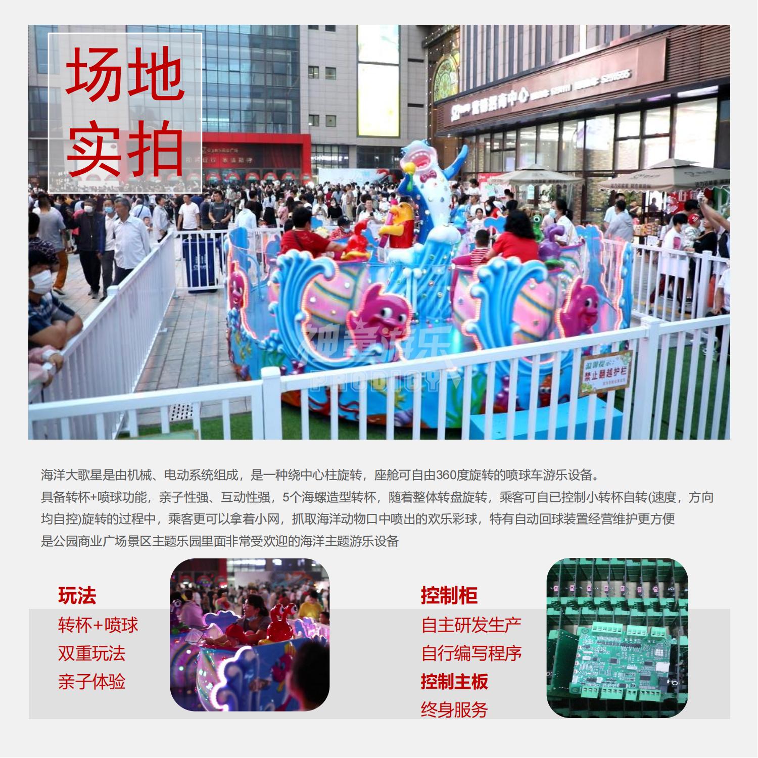 海洋大歌星是由機械、電動系統(tǒng)組成,是一種繞中心柱旋轉(zhuǎn),座艙可自由360度旋轉(zhuǎn)的噴球車游樂設備。具備轉(zhuǎn)杯+噴球功能,親子性強、互動性強,5個海螺造型轉(zhuǎn)杯,隨著整體轉(zhuǎn)盤旋轉(zhuǎn),乘客可自已控制小轉(zhuǎn)杯自轉(zhuǎn)(速度,方向均自控)旋轉(zhuǎn)的過程中,乘客更可以拿著小網(wǎng),抓取海洋動物口中噴出的歡樂彩球,特有自動回球裝置經(jīng)營維護更方便是公園商業(yè)廣場景區(qū)主題樂園里面非常受歡迎的海洋主題游樂設備。