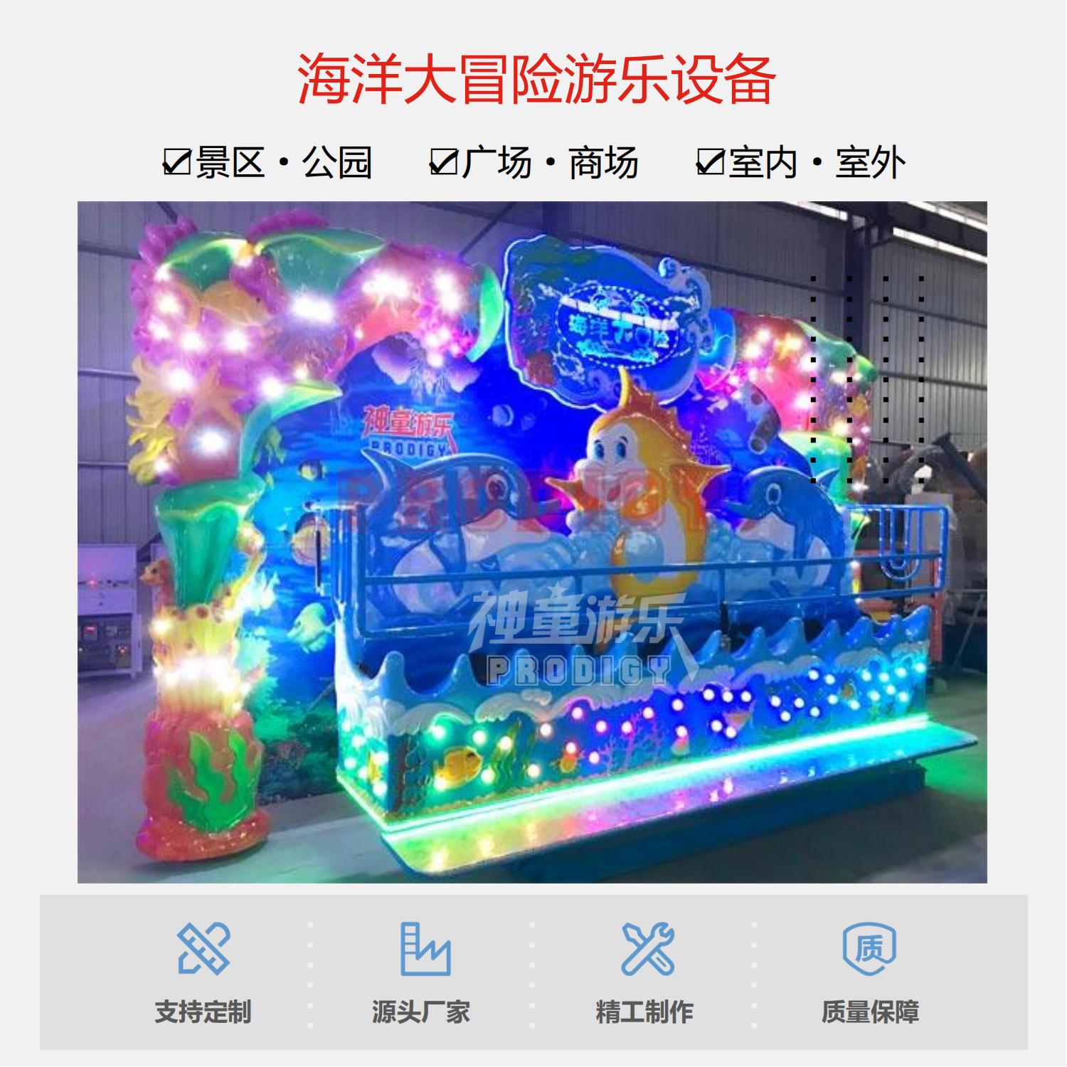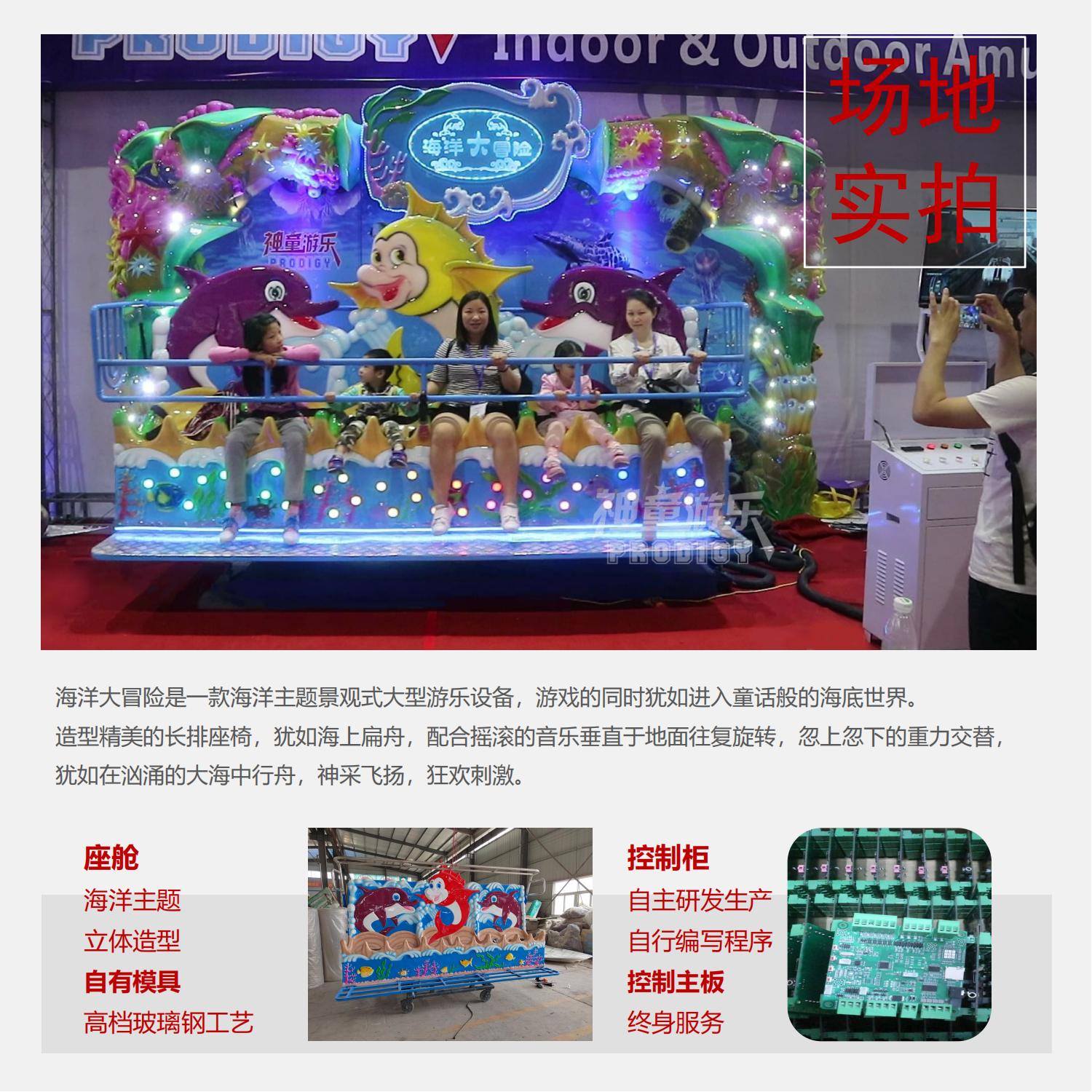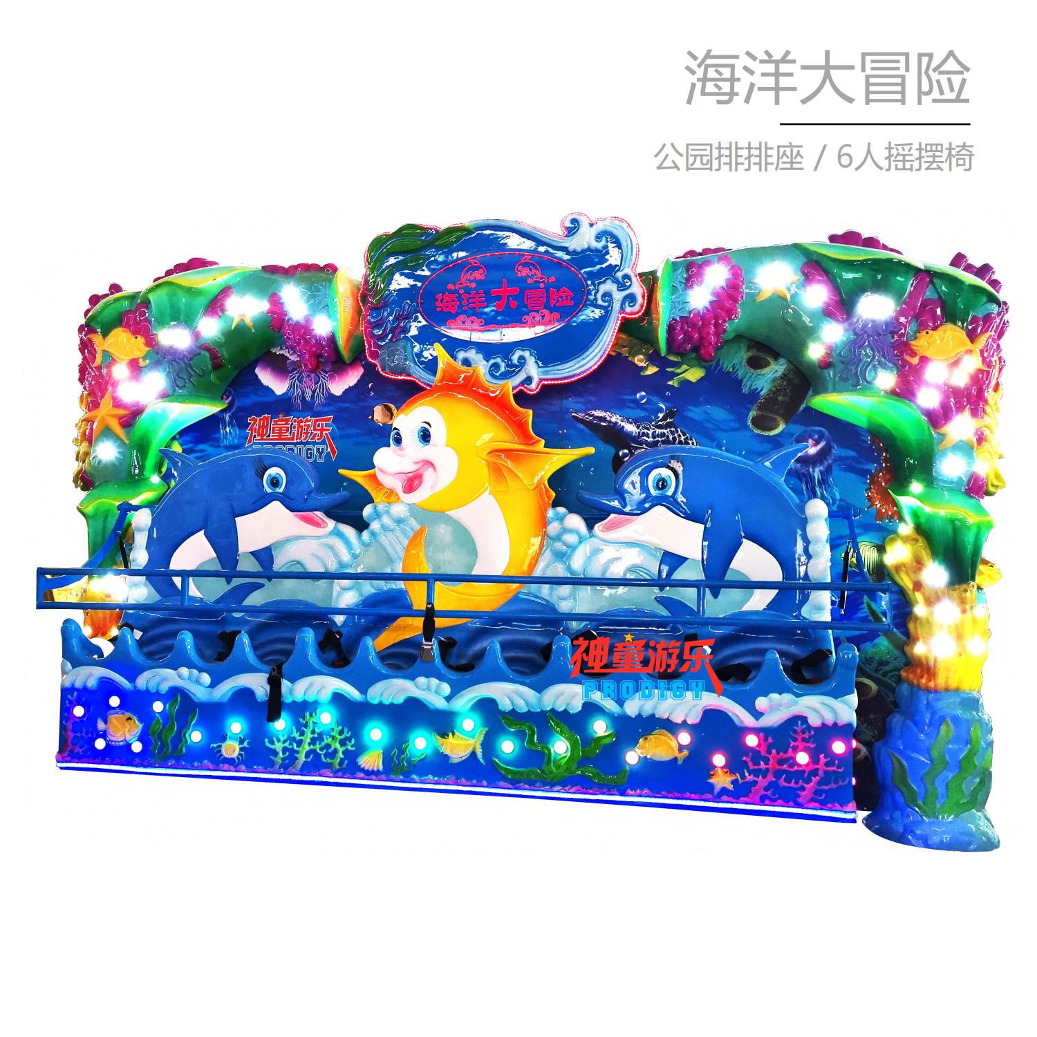 海洋大冒險是一款海洋主題景觀式大型游樂設(shè)備,游戲的同時猶如進入童話般的海底世界。造型精美的長排座椅,猶如海上扁舟,配合搖滾的音樂垂直于地面往復(fù)旋轉(zhuǎn),忽上忽下的重力交替猶如在洶涌的大海中行舟,神采飛揚,狂歡刺激。
