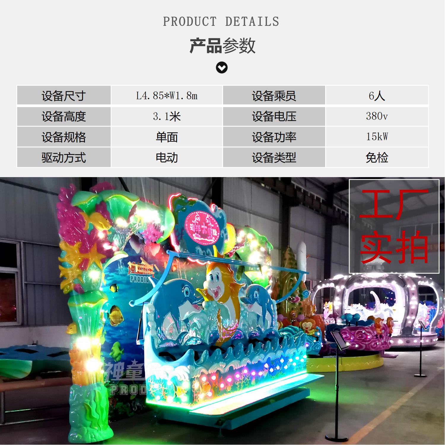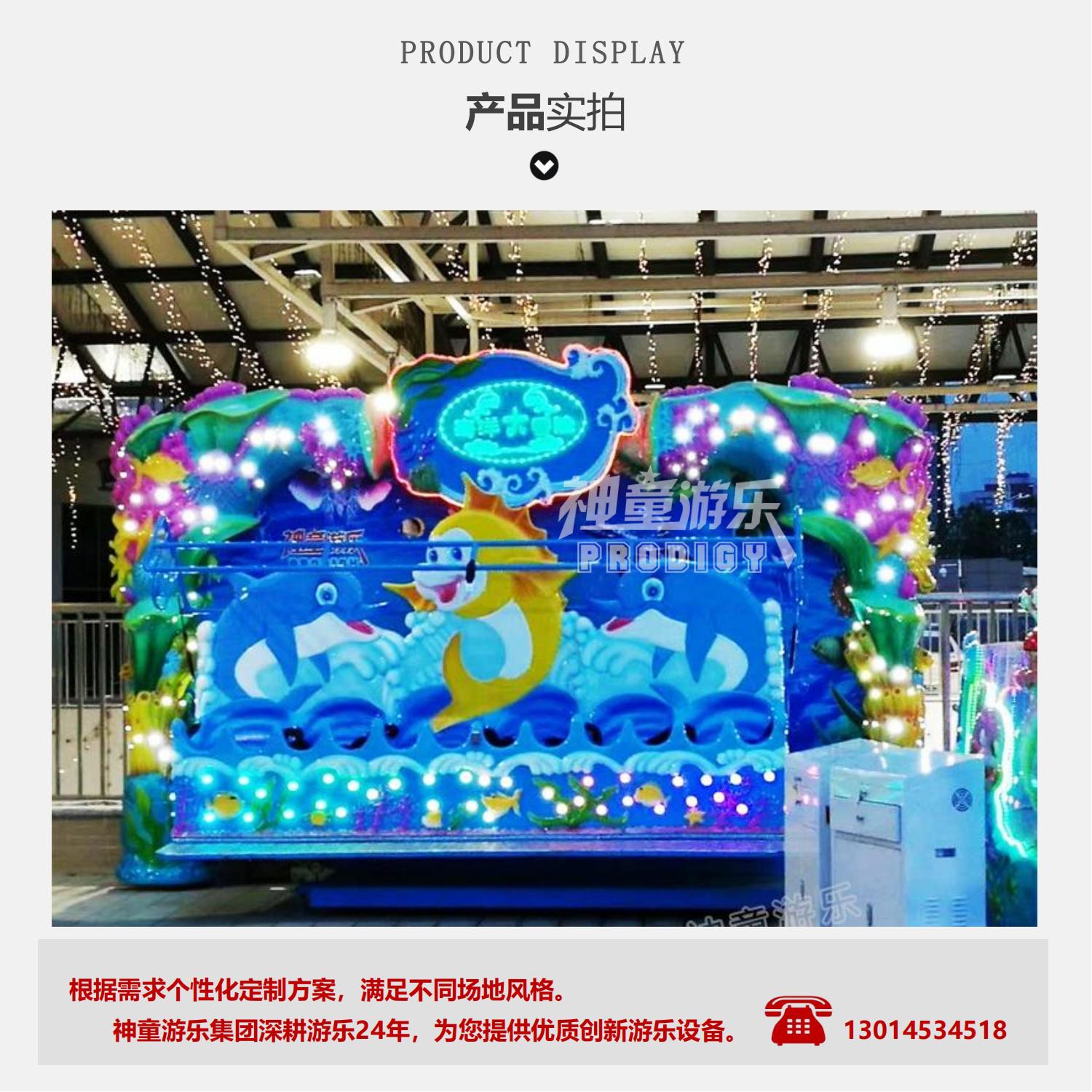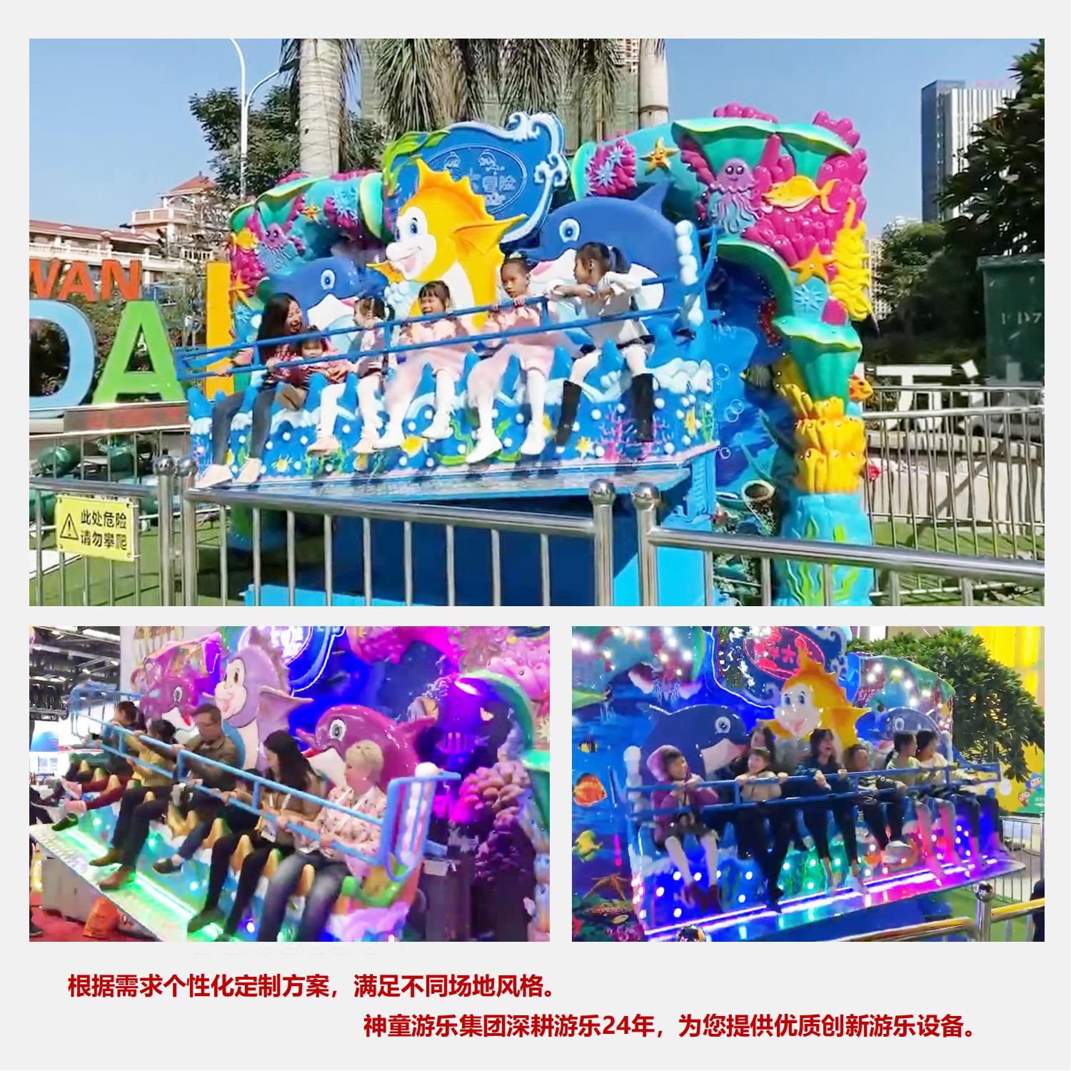 海洋大冒險是一款海洋主題景觀式大型游樂設(shè)備,游戲的同時猶如進入童話般的海底世界。造型精美的長排座椅,猶如海上扁舟,配合搖滾的音樂垂直于地面往復(fù)旋轉(zhuǎn),忽上忽下的重力交替猶如在洶涌的大海中行舟,神采飛揚,狂歡刺激。