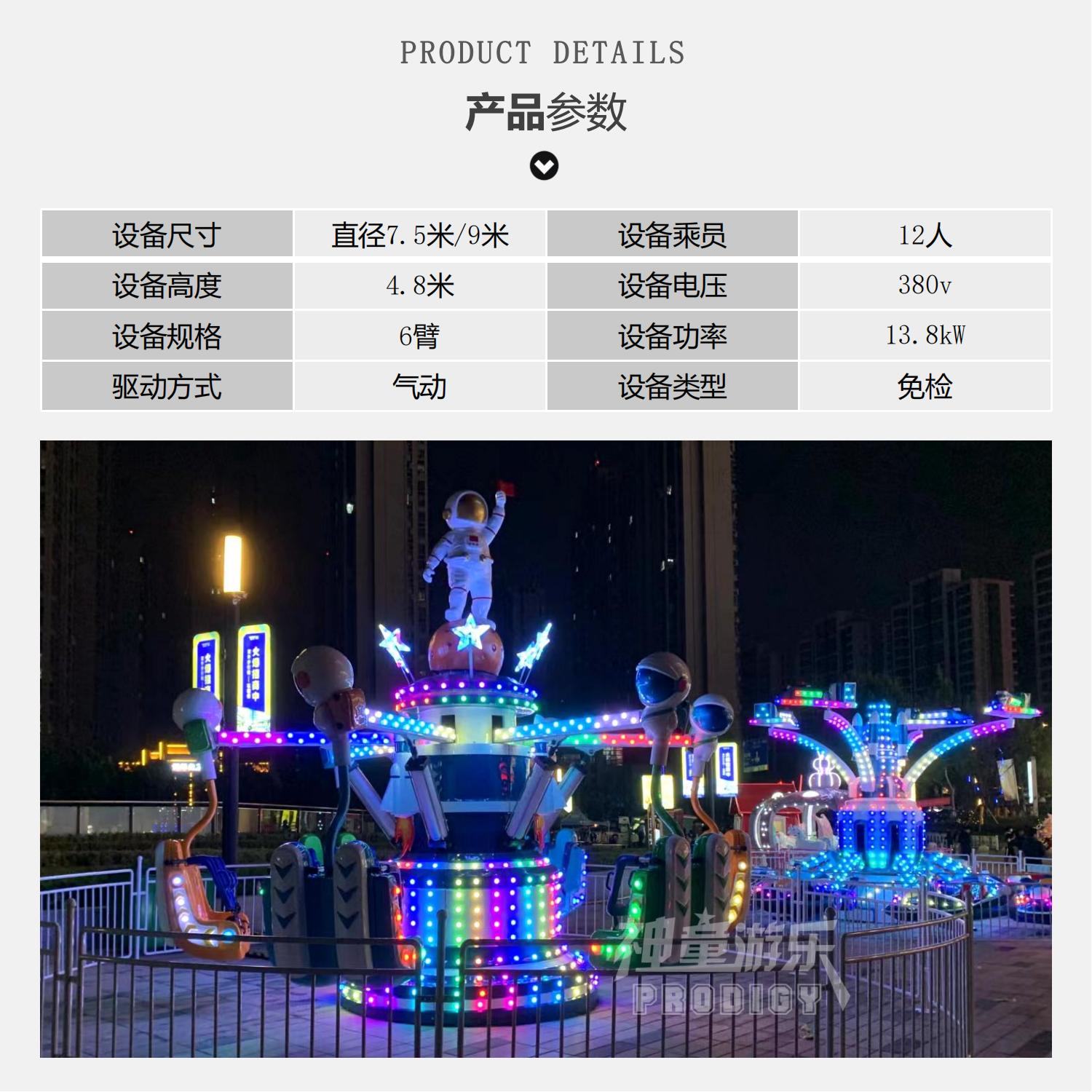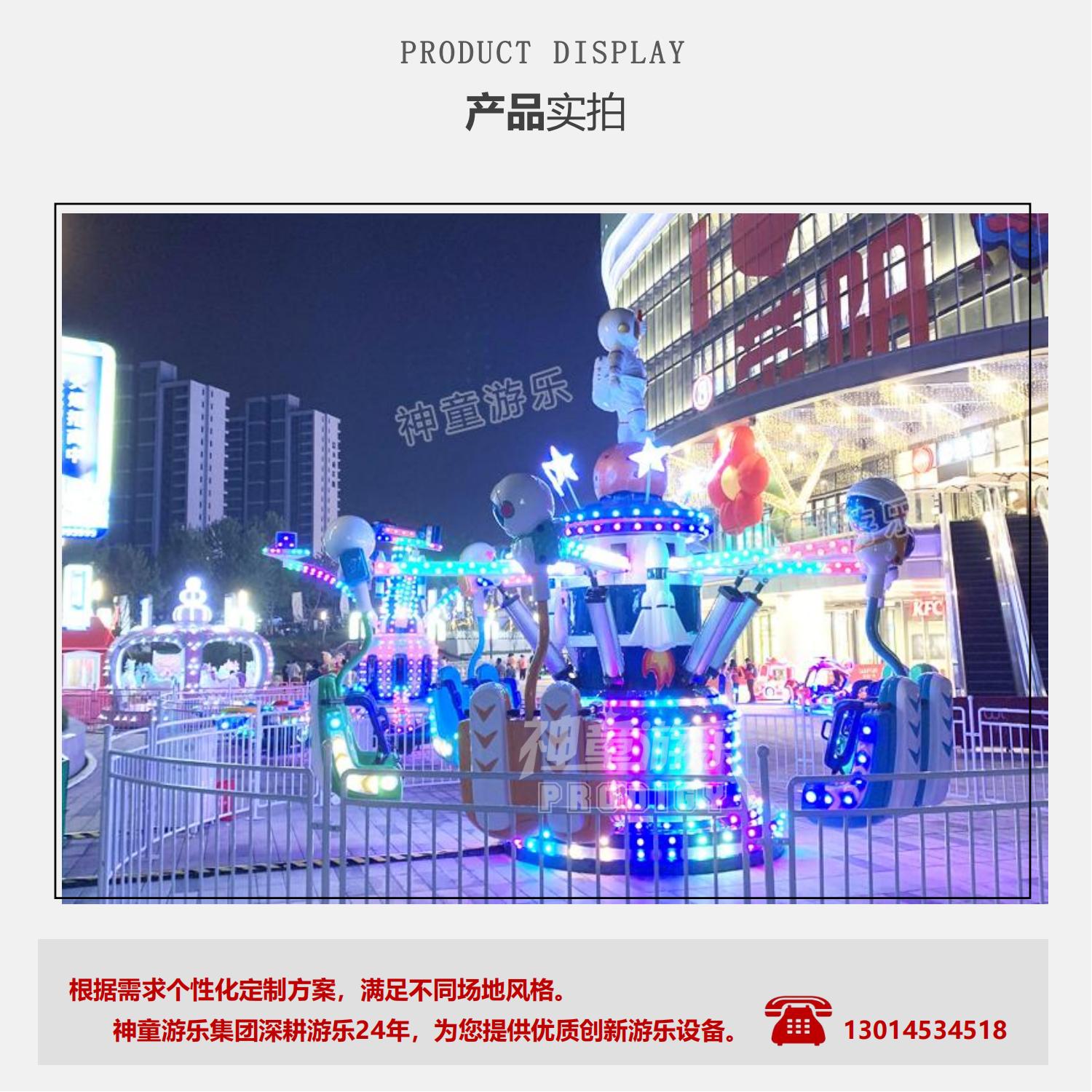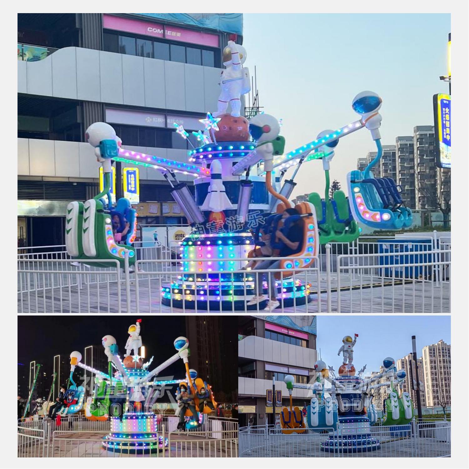 航天夢(mèng)是由機(jī)械、氣動(dòng)和電氣系統(tǒng)組成,是一種繞垂直軸中心旋轉(zhuǎn)、升降自由的升降飛機(jī)類游樂設(shè)備。 雙人親子座艙,游客在飛行跟隨大盤旋轉(zhuǎn),座艙會(huì)有節(jié)奏的彈跳升降和自轉(zhuǎn),會(huì)有失重感,安全且刺激,令人流連忘返。 航天夢(mèng)不但性能優(yōu)異,操作簡(jiǎn)單,太空主題非常新穎、華麗迷人的彩燈裝飾,逼真刺激的空戰(zhàn)音響效果,深受大人兒童喜愛。
