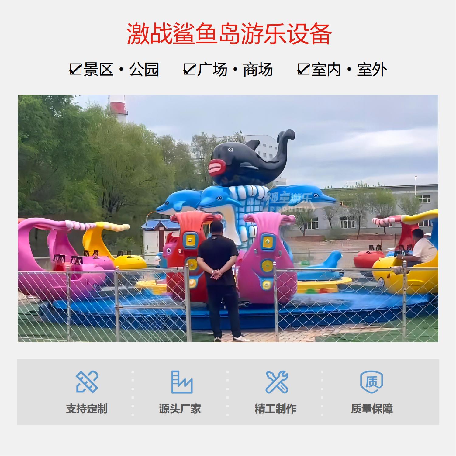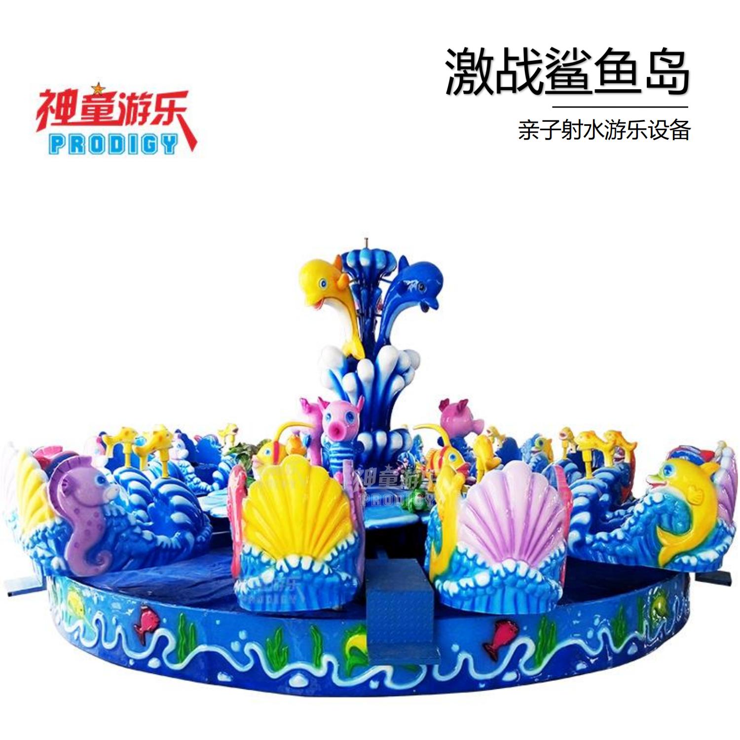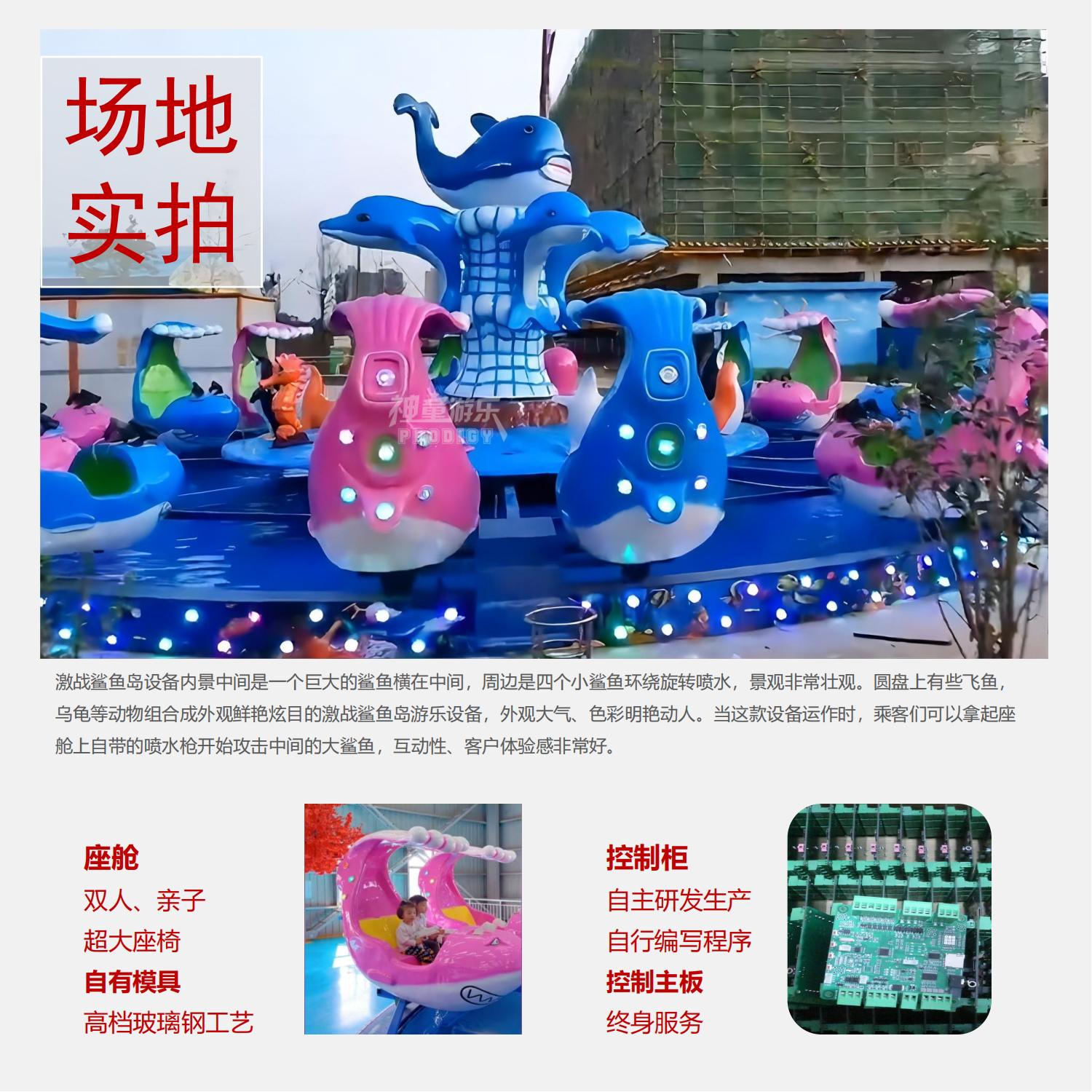激戰(zhàn)鯊魚島設(shè)備內(nèi)景中間是一個(gè)巨大的鯊魚橫在中間,周邊是四個(gè)小鯊魚環(huán)繞旋轉(zhuǎn)噴水,景觀非常壯觀。圓盤上有些飛魚,烏龜?shù)葎游锝M合成外觀鮮艷炫目的激戰(zhàn)鯊魚島游樂設(shè)備,外觀大氣、色彩明艷動人。當(dāng)這款設(shè)備運(yùn)作時(shí),乘客們可以拿起座艙上自帶的噴水槍開始攻擊中間的大鯊魚,互動性、客戶體驗(yàn)感非常好。