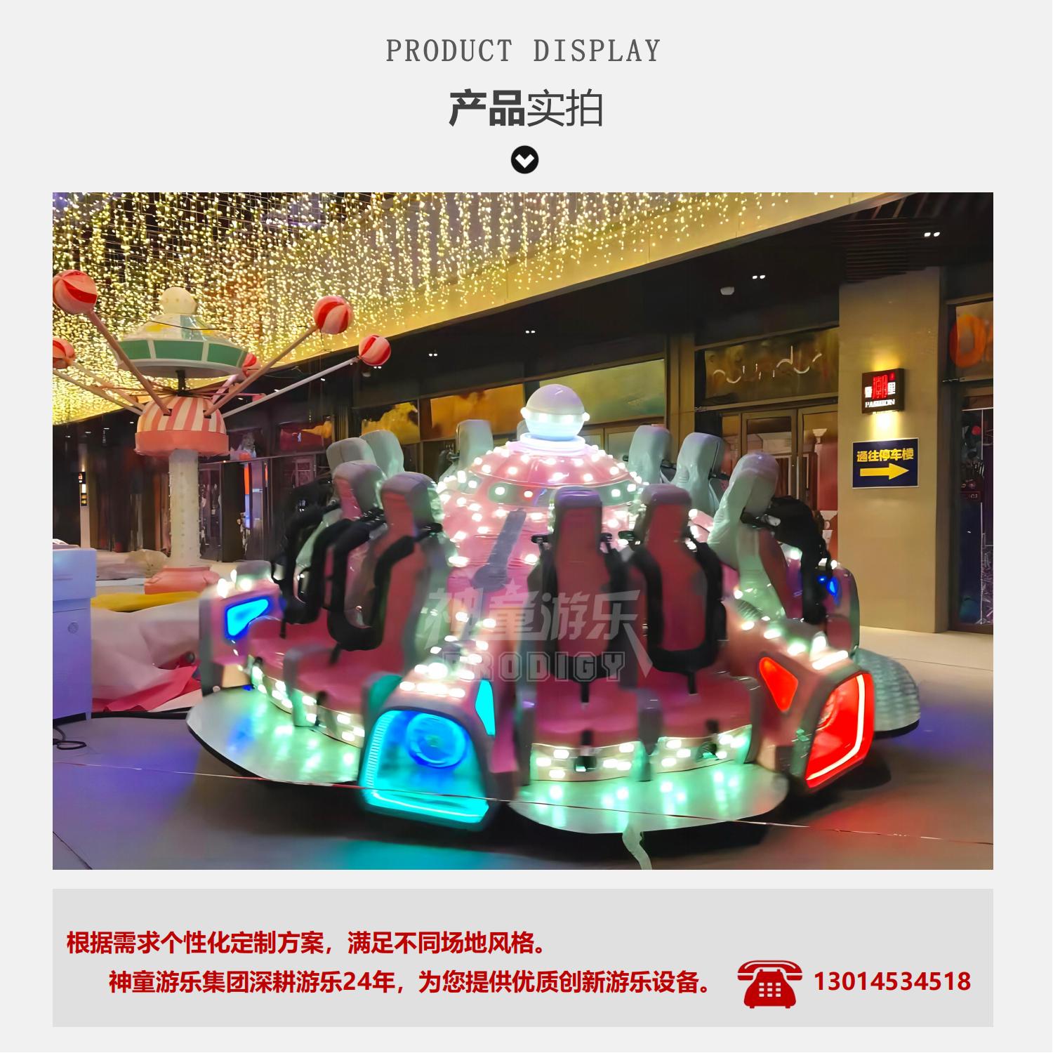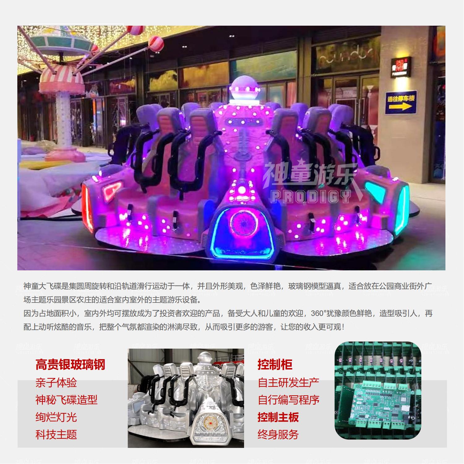 神童大飛碟是集圓周旋轉(zhuǎn)和沿軌道滑行運動于一體,并且外形美觀,色澤鮮艷,玻璃鋼模型逼真,適合放在公園商業(yè)街外廣場主題樂園景區(qū)農(nóng)莊的適合室內(nèi)室外的主題游樂設(shè)備。因為占地面積小,室內(nèi)外均可擺放成為了投資者歡迎的產(chǎn)品,備受大人和兒童的歡迎,360°猶豫顏色鮮艷,造型吸引人,再配上動聽炫酷的音樂,把整個氣氛都渲染的淋漓盡致,從而吸引更多的游客,讓您的收入更可觀!